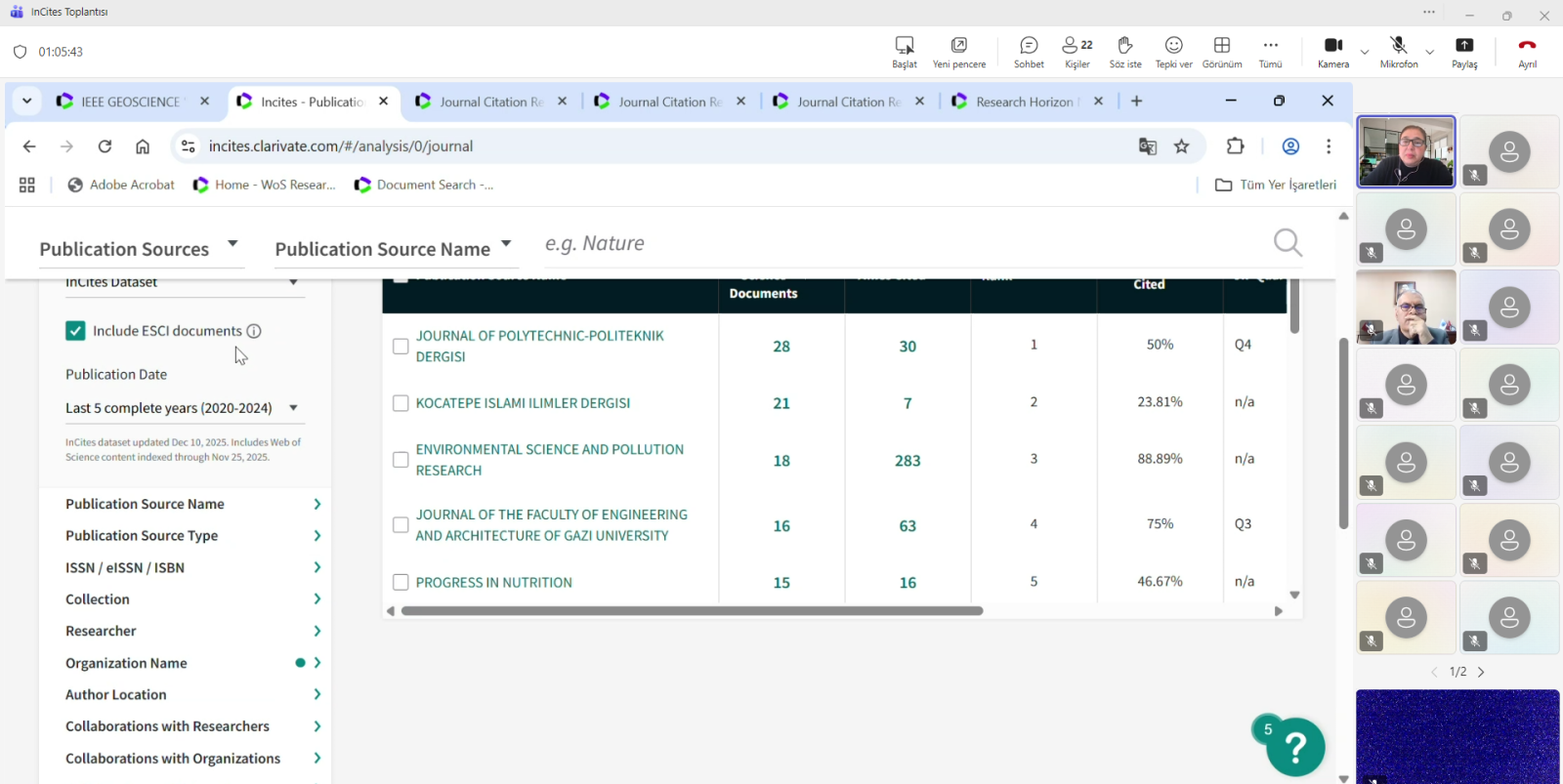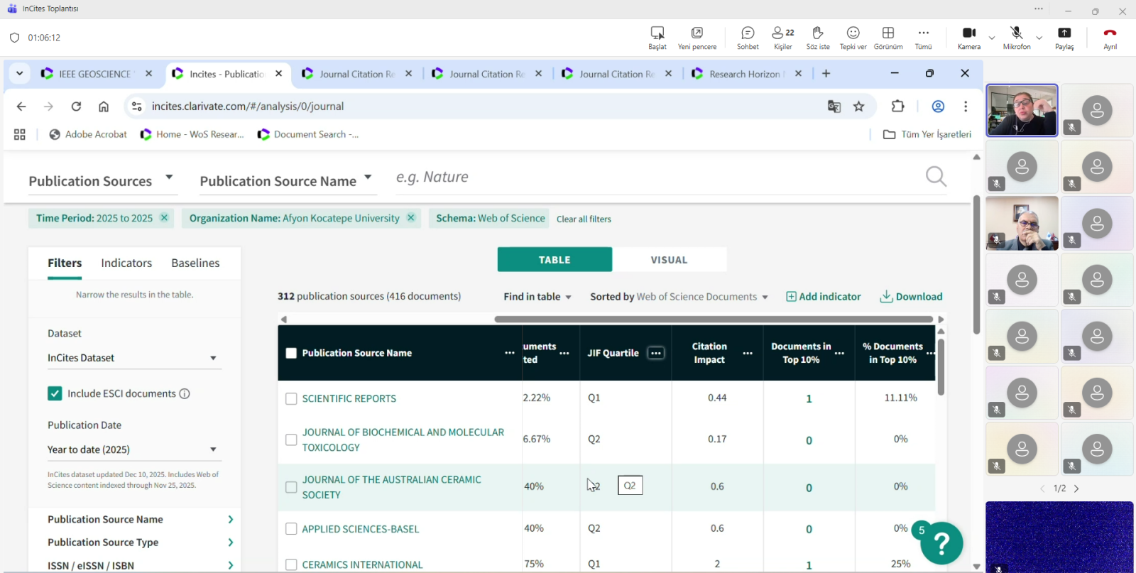 12 Aralık 2025 Cuma günü saat 11.00’de, Clarivate firması Kıdemli Müşteri Başarı Danışmanı Derya SOĞUKSU tarafından, araştırma çıktılarının ölçümü ve karşılaştırmalı analiz imkânları sunan InCites platformuna ilişkin çevrimiçi bir tanıtım toplantısı yapılmıştır. Toplantıda platformun kullanım özellikleri, sağladığı analiz türleri ve akademik birimlerimize yönelik katkıları aktarılmıştır. Etkinliğe; Sayın Rektör Yardımcılarımız Prof. Dr. Murat PEKER, Prof. Dr. Şuayıp ÖZDEMİR ile Kalite Koordinatörlüğü, Ar-Ge Koordinatörlüğü, Bilimsel Yayın Koordinatörlüğü, Uluslararasılaşma Koordinatörlüğü, Bilgi İşlem Daire Başkanlığı ve Kütüphane ve Dokümantasyon Daire Başkanlığı yöneticileri ve personeli katılmıştır.