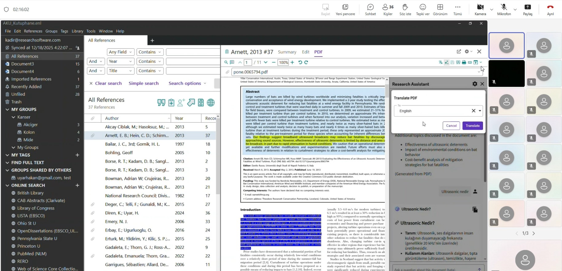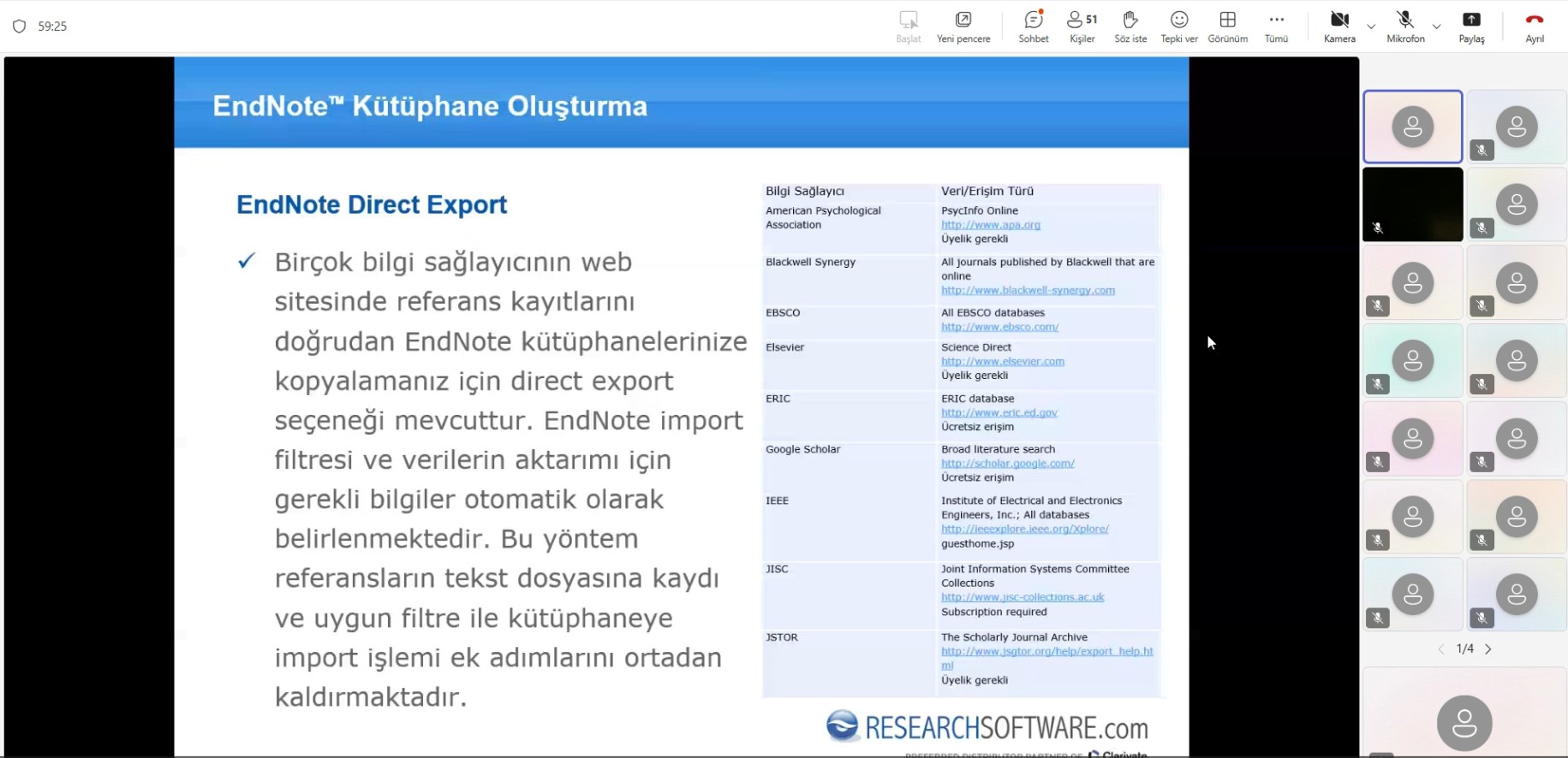 18 Aralık 2025 Perşembe günü saat 15.00’te, Clarivate firması Satış ve Destek Danışmanı Kadir DİREN tarafından, Üniversitemiz akademik personeline yönelik olarak EndNote uygulaması hakkında çevrimiçi bir eğitim düzenlenmiştir. Eğitimde, bilimsel yazım ve araştırma süreçlerinde kaynak düzenleme, atıf yapma, kaynak paylaşımı, kişisel kütüphane oluşturma ve veri tabanı entegrasyonu gibi konular ele alınmıştır.