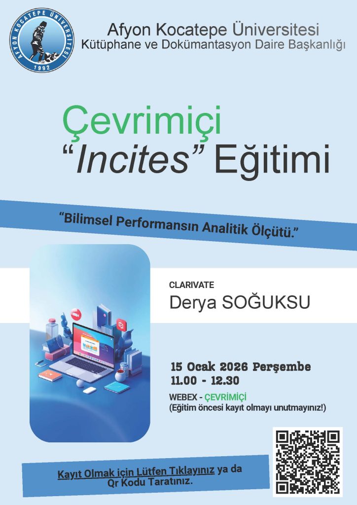 Değerli Araştırmacılarımız, Dergi etki faktörü- JIF, quartiles verilerine erişme, araştırma girdi ve çıktılarının ölçümü, güncel trendlerin takibi, makalelerin, dergilerin, kurumların, kişilerin ve bölgelerin karşılaştırılması imkanını sunan; bütünleşik web tabanlı akademik bir platform olan “Incites” hakkında, platformun kullanımı, sunduğu analiz imkanları ve akademik birimlerimize sağlayacağı katkıların detaylı olarak anlatılacağı çevrimiçi bir eğitim toplantısı düzenlenecektir. Aşağıda belirtilen tarih ve saatte Webex üzerinden gerçekleştirilecek olan çevrimiçi eğitim toplantısına katılımlarınızı bekliyoruz. (***Eğitim öncesinde kayıt olunması gerekmektedir.) Eğitim Tarihi: 15 Ocak 2026 Perşembe Eğitim Saati: 11.00-12.30 Kayıt Adresi: https://clarivatesupport.webex.com/weblink/register/raa34ee43452881e3bf35256000121db8