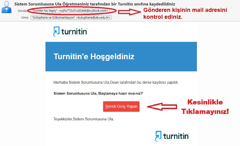 Bu e-postalar üniversitemiz tarafından gönderilmemiştir ve resmî bir Turnitin bildirimi değildir.