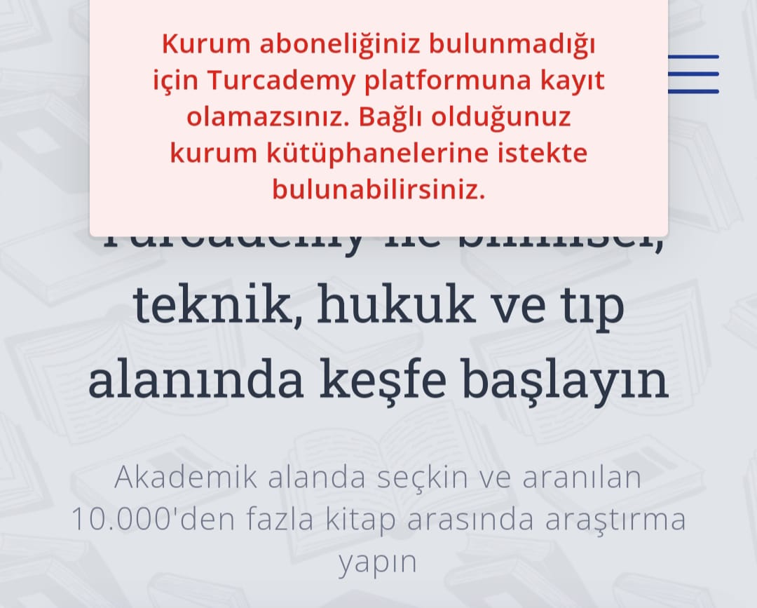 *** Turcademy veri tabanına erişim sağlayabilmeniz/kayıt olabilmeniz için mutlaka kurum ağına bağlı olmanız ya da VETİS Uzaktan Erişim Sistemi üzerinden bağlantı sağlıyor olmanız gerekmektedir. Aksi takdirde " Kurum aboneliğiniz bulunmadığı için Turcademy platformuna kayıt olamazsınız.Bağlı olduğunuz kurum kütüphanelerine istekte bulunabilirsiniz." şeklinde bir uyarı ile karşılaşırsınız.